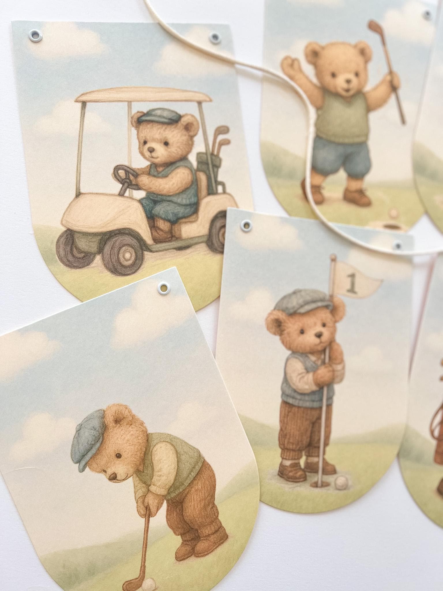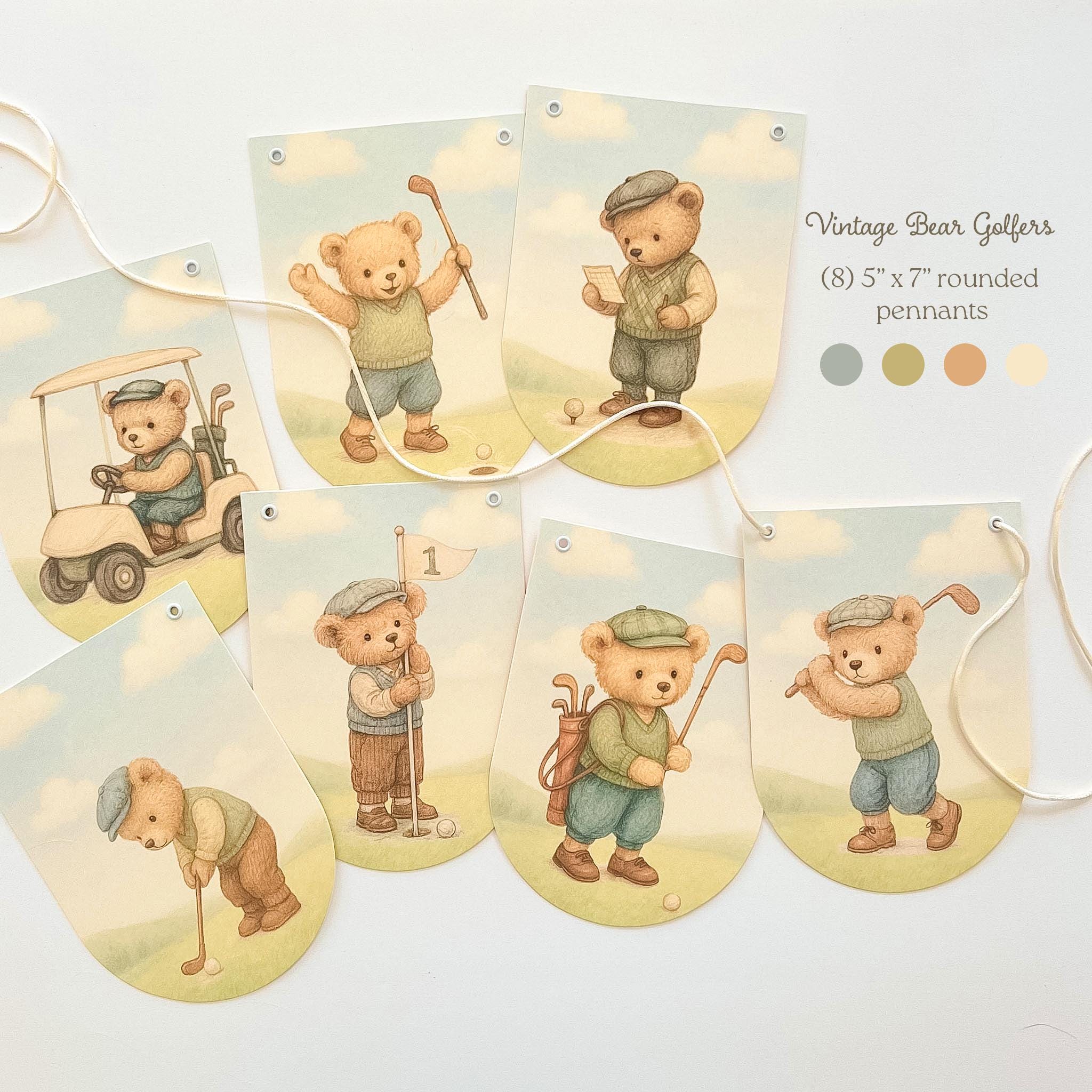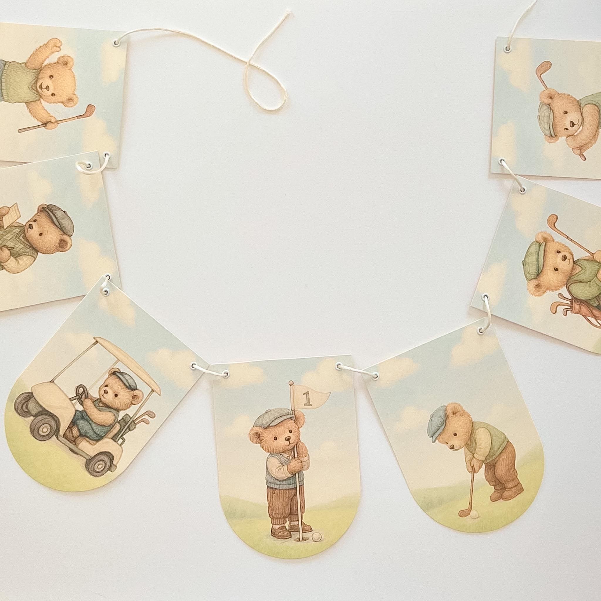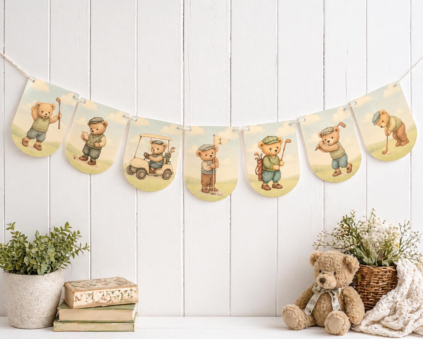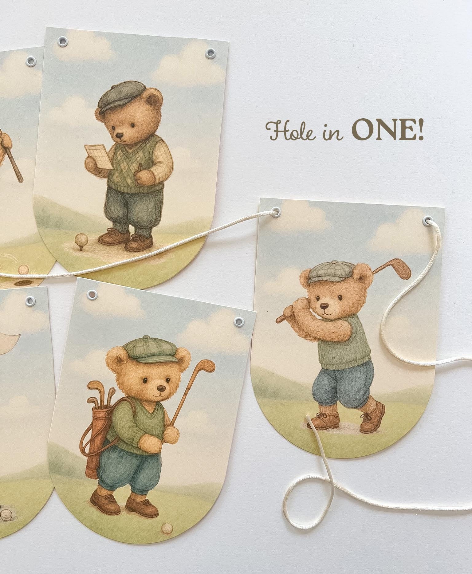 A sweet, storybook take on a classic “Hole in One” celebration—this vintage teddy bear golf banner brings a gentle, heirloom feel to your little one’s first birthday.